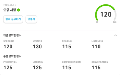 2주 완성반 등록 후 성실히 따라오신 결과 목표하셨던 점수인 120점 달성에 성공하셨습니다. 꾸준한 노력 덕분입니다. 진심으로 축하 드립니다!🎊